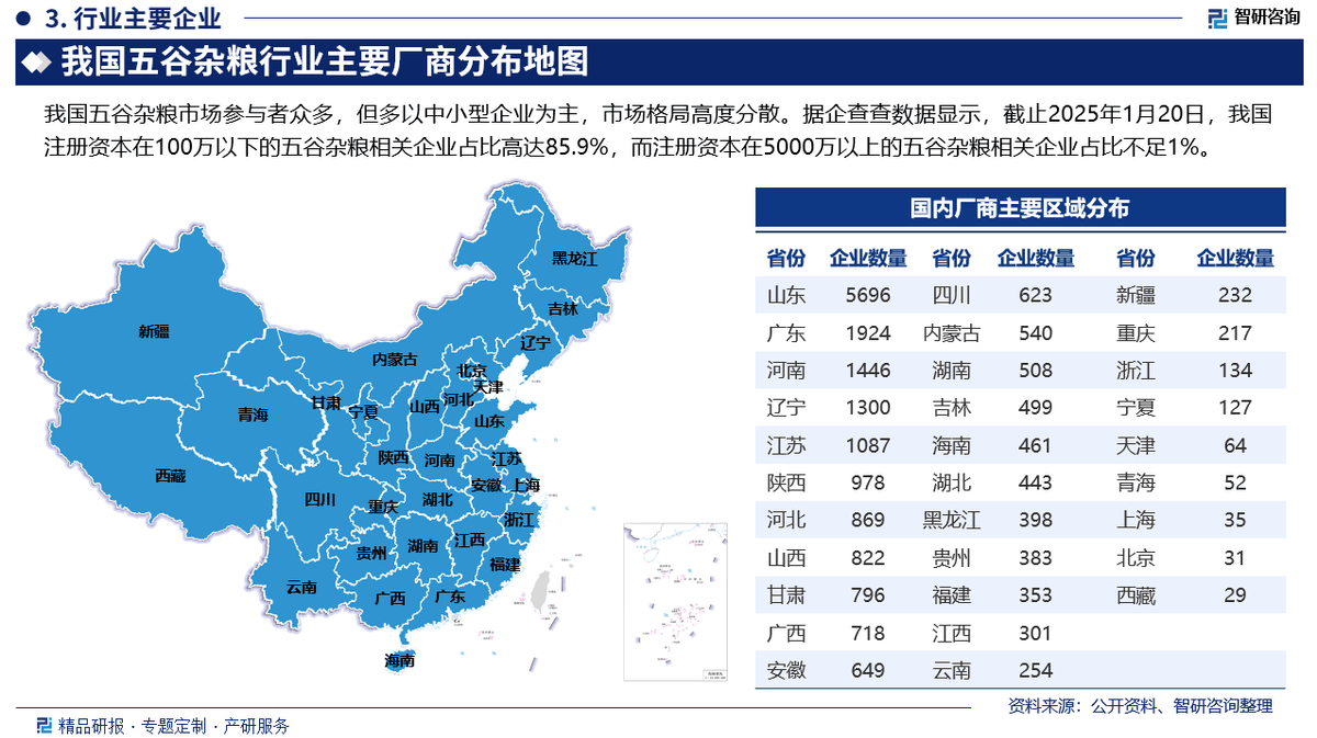 我国五谷杂粮市场参取者浩繁,但多以中小型企业为从,市场款式高度分离。据企查查数据显示,截止2025年1月20日,我国注册本钱正在100万以下的五谷杂粮相关企业占比高达85。9%,而注册本钱正在5000万以上的五谷杂粮相关企业占比不脚1%。目前,我国五谷杂粮行业内代表企业次要包罗益海嘉里金龙鱼食物集团股份无限公司、十月稻田集团股份无限公司、安徽燕之坊食物无限公司、山西沁州黄小米(集团)无限公司、东北大无机食物集团无限公司、省和粮农业无限公司、北大荒农垦集团无限公司、方家铺子(莆田)绿色食物无限公司等。