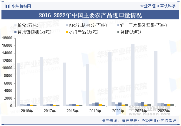 2022年我国农产物进口次要以粮食为从,按照海关总署的统计口径,我国粮食进口量为14687万吨,同比下降10。7%。鲜、干生果及坚果、食用动物油、水海产物、食糖进口量别离为753万吨、648万吨、454万吨、527万吨。